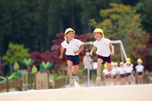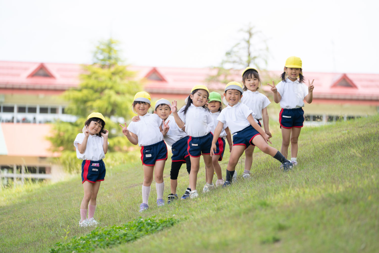 飛騨高山という地域の環境を生かした緑いっぱいの園内では、子どもたちがのびのびと元気に遊んでいます。体力・人間性・協調性を教育目標に掲げ、「遊びから学ぶ」ことができるよう子どもたちに様々な経験の場を設けています。